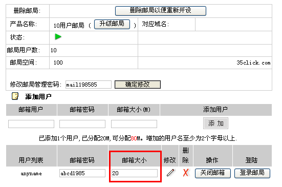 您只需要使用在我司的会员名与密码登录www.35.com的管理中心,再点击"企业邮局管理"-"管理":
