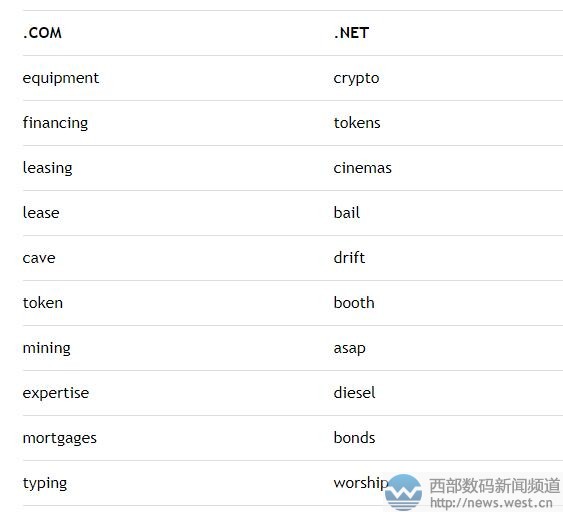 威瑞信6月月报:虚拟货币热度不减!“crypto”再成最受欢迎域名关键词三五互联(35.com)7月13日讯,海外消息,近日威瑞信发布了6月份域名注册热门关键词月报。总体来说,域名最热注册词与当前社会经济热度相对应,像crypto、token继5月后,再度成为最热关键词。 .com方面,“equipment”(设备,器材、配件)力压众多关键词一举成为最受欢迎的.com域名注册词汇。Equipment除了对应有知名法国服饰品牌以外,本身还可以与多个行业多诸多词语组合,可应用的领域非常广。 随后是“financing”(融资、理财),作为一个金融类词语,与此相关的域名可用来搭建投资理财等终端平台。同样属于金融行业词的还有 “mortages”(抵押贷款),相关域名用来搭建抵押借贷平台比较合适。 另外,两个有着“租赁”之意的词语“leasing”和“lease”也成为6月份的注册热词,可用于汽车、房产等多个行业租赁平台。除此以外,“token”(代币)、“mining”(采矿)、“cave”(洞穴)、“typing”(打字)均成为6月热门注册词汇。 .net方面,两个虚拟货币类词语“crypto”(加密货币)、“token”(代币)是6月最受欢迎的注册词汇。今年以来,虚拟货币行业的疯狂发展,不仅使得相关域名成交价水涨船高,也催生了大批域名渊源不断的被注册。 随后,“cinemas”(电影院)一词在本月注册量也极大,近年来,全球影视市场风起云涌,不少大佬纷纷进军电影领域,加上今年大片不断,“电影院”人气高涨。 除此以外,“bail”(保释金)、“drift”(漂泊)、“booth”(售货棚)等词也榜上有名。 本文转载自新闻资讯,原文链接:威瑞信6月月报:虚拟货币热度不减!“crypto”再成最受欢迎域名关键词