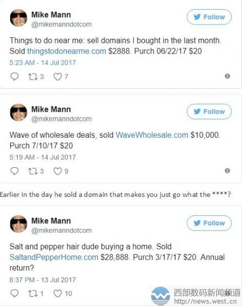 4天获利500倍!论域名玩得溜,我只服Mike Mann三五互联(35.com)7月14日消息,说真的,小编每次报道Mike Mann的交易消息时,内心都有止不住的羡慕嫉妒恨。尤其是今天这几个域名的交易,小编真的有一种“老大爷倒了都不扶”(不要当真),就服Mike Mann。 就这两天Mike Mann发出三条推特,公布了三枚域名的交易情况。其中,组合域名saltandpepperhome.com成交价高达28,888美元,约合人民币19.5万元,直译为“盐和胡椒之家”,也可指代“黑人和白人混合家庭”。“salt and pepper”在美国是一个比较常用的俚语,使用频率较高。据whois查询,这个域名早在2007年就已注册了,今年3月份Mike Mann以20美元的价格拿下该域名,短短四个月时间,可谓身价暴涨。 而另外两枚域名则最近一个月才低价收购的,其中thingstodonearme.com于6月22日收购,成本仅20美元,成交价为2888美元,约合人民币1.95万元。该域名直译为“在我附近做的事”,适合搭建备忘录等软件。而另一个成本仅20美元却在短短4天时间内卖出10,000美元的域名则是wavewholesale.com,直译为“wave批发”。 讲真,Mike Mann出售的这些域名也许在国人眼里并没有多少价值,字符又长难记又难输入,但这些域名在以英语为母语的国家中,价值又不一样了。而且,重点在于像wavewholesale.com这样的域名,7月10号以20美元收购,仅隔四天就转手以10,000美元卖出,这种域名销售神话,Mike Mann到底是如何创造的? 本文转载自新闻资讯,原文链接:4天获利500倍!论域名玩得溜,我只服Mike Mann