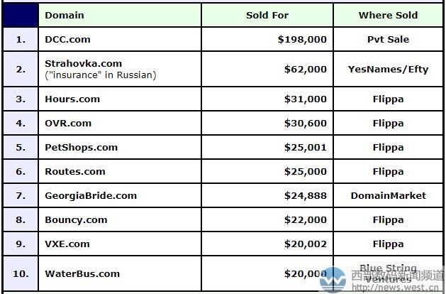 DN榜:三字母域名DCC.COM以134万元夺冠!“保险”域名被终端拿下三五互联(35.com)7月14日消息,本期的DN交易榜(7.3-7.9)上,高价成交的域名还不少,一扫往日夏季域名市场萧条的状态。本期夺得DN榜冠军的是三字母域名DCC.COM,成交价为19.8万美金,约合人民币134万元。 域名DCC.COM注册于1997年9月,距今快20年历史了。作为ABB型域名,DCC.COM品相出众,简短易记,而且又是三声母域名,对应诸多丰富词语,比如“多查查、调查处、冬虫草、搭错车、电磁场、大操场、电池厂”等,可广泛用于医疗、科学、信息查询、交通出行等领域,应用空间很大。据了解,域名DCC.COM是私下交易的,其高达134万元的成交价让其跻身目前为止今年成交价最高的20强域名之列。 排名第二的是域名Strahovka.com,成交价为62,000美元,约合人民币42万元。这个域名注册于2005年5月,是俄语中“保险”的意思,特别适合搭建保险行业终端网站。据whois查询,域名Strahovka.com已在7月7日转移到了终端买家payoneer.com名下。 随后是以31,000美元和30,600美元在Flippa平台成交的域名hours.com和ovr.com,约合人民币21万元。前者是英语常用单词,是“小时、时辰”的意思,可用来搭建服饰、美容、以及在线电商等终端网站,应用空间不错。后者ovr.com则有“哦VR”的意思,适合用于虚拟现实领域。 本期榜单的第五名来自英文组合域名petshops.com,成交价为25,001美元,约合人民币17万元。该域名早在1996年就已注册,其“宠物店、宠物商店”的含义清晰,指向明确,非常适合搭建宠物销售网站或者宠物其他相关服务平台。 另外,紧随其后的域名routes.com也拍出25,0000美元价格,该域名是“路径、路途”的意思,可搭建旅行相关平台。其他域名,比如 “快活”Bouncy.com、vxe.com、“水上巴士”waterbus.com、“洋葱”Onions.com、“打印、印刷”Print.net等也以不错价格成交。 其他交易域名详见下图: 本文转载自新闻资讯,原文链接:DN榜:三字母域名DCC.COM以134万元夺冠!“保险”域名被终端拿下