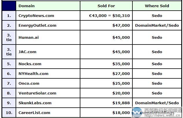 “加密消息”域名领衔DN榜!“能源”域名紧随其后三五互联(35.com)8月17日消息,本期 DN交易榜(7.31-8.13)上,英文组合域名cryptonews.com以43,000欧元夺得第一,约和人民币33.8万元。 域名cryptonews.com注册于1999年,主体由crypto和news组合而成,具有“加密消息”的意思,用来搭建网络安全平台比较合适。另外,今年以来加密货币(CryptoCurrency)等虚拟货币行情不错,Crypto news也可指代加密货币方面的新闻,用来搭建相关资讯平台也很合适。据查询发现,相关域名cryptonews.biz/.org目前均已建站。 排名第二的是域名energyoutlet.com,成交价为47,000美元,约合人民币31万元。该域名由英文单词“energy”(能源)和“Outlet”(出口、批发)组合而成,适合用于能源相关领域名。 本期DN榜上,国别域名human.ai表现不错,以45,000美元的成交价跻身三强。.ai后缀原是乌拉圭国别域名,但因其与人工智能(Artificial Intelligence)相对应,后多用于人工智能领域。域名human.ai代表有“人、人类”的意思,是很常见的英语词汇,用来搭建人工智能相关平台价值不错。 与Human.ai并列第三的还有三字母域名jac.com,该域名注册于1995年3月,在中文里有“聚爱财”的含义,非常适合搭建金融理财平台。除此以外,jac.com还对应有不少终端,比如jac江淮汽车(jac.com.cn)、JAC外贸实战博客(jacindustry.org)、JAC服装品牌设计(jacline.cn)等等。 除此以外,因为域名nocks.com(作凹痕于、箭扣)以35,000美元成交;组合域名nyhealth.com(纽约健康)以27,000美元成交;onco.com(致癌)成交价为25,000美元。其他域名也有不错表现,交易详见下图: 本文转载自新闻资讯,原文链接:“加密消息”域名领衔DN榜!“能源”域名紧随其后