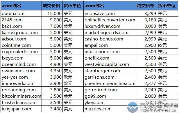 Sedo榜:终端近10万元买下“突角”域名!两枚国别域名表现抢眼三五互联(35.com)8月30日消息,最新一期的sedo交易榜出炉,本期上榜的域名共有60个,其中卖价最贵的是英文域名quoin.com,成交价为15,000美元,约合人民币9.9万元。 域名quoin.com注册于2001年6月,是英文单词“突角、隅石”的意思。从含义上看,该域名并没有什么特别之处,不过却对应有软件公司QuoinInc以及女性饰品品牌Quoin,由此可见可应用的领域很广。目前域名quoin.com被德国一家资讯网站收购,官网域名为t-online.de。 本期sedo榜上,.com域名表现平平。排名第二的数字域名2145.com成交价为9000美元,约合人民币6万元。该域名注册于1999年,距今已经18年历史了,拥有一般四数字域名的短小精湛和建站不受限制等优势,市场价值比较坚挺。 随后是杂米域名bt21.com,成交价为7000美元,从品相和含义上分析,该域名比较适合搭建比特币交易及游戏平台。除此以外,本期sedo上多个英文域名成交,比如cointime(硬币时间)、adsoul.com(广告灵魂)均以5000美元结拍。
