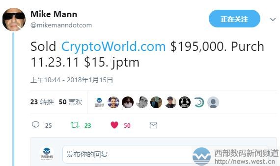 成本15美元!Mike Man以125万元售出域名“加密世界”1月16日消息,前几日威瑞信刚发布12月.com域名热门注册词汇,“加密货币”cryptocurrency、“比特币”bitcoin等词再度上榜,连续多月成为域名注册的风向标。而昨天,大佬Mike Man超百万元售出cryptoworld.com让“加密”域名再成焦点。 昨天上午,海外知名投资人Mike Man在推特上自曝:以195,000美元(约合人民币125万元)售出域名cryptoworld.com,而该域名于2011年收购时成本仅15美元。 域名cryptoworld.com注册于2004年,由“crypto”(加密)和“world”(世界)组合而成。就含义而言,无疑与当前火热的加密货币行业紧密相连,用来搭建相关交易、资讯等平台都不错,应用空间和市场价值都毋庸置疑。 据NameBio记录显示,域名cryptoworld.com在2016年售价仅为485美元,约合人民币3116元。随后在2017年6月,外媒曾在Screenshots.com的存档截图中发现CryptoWorld.com的售价已达29,888美元,约合人民币19.2万元。而短短半年之后,域名CryptoWorld.com已飙升至百万,涨幅惊人。 如此涨势自然与数字货币的火热分不开,近年来比特币、加密货币等虚拟货币席卷全球,顺势带火了相关域名,高价易主消息不绝于耳。比如:域名GoldCoin.org就被终端以8万欧元收购;域名coinwin.com以小六位美金易主;前段时间中东买家还以63万元拿下“加密率”域名Cryptorate.com。