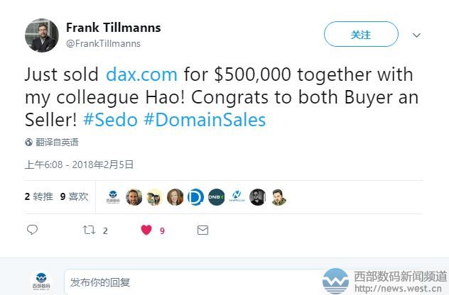三字母域名Dax.com超300万元高价易主!2月6日消息,昨天晚上Sedo平台经纪人Frank Tillmanns发推称,与中国经纪人同事Hao共同中介成交了一枚三字母域名Dax.com,价格为500,000美元,约合人民币315万元。 域名Dax.com注册于1997年,距今已有21年历史,在中文里有“大学、大笑、答谢、大象、大侠”等含义,适合搭建电商、游戏以及问答平台;在英文里,字母DAX又是“数据分析表达式”(DAX)、德国股票指数(Deutscher Aktienindex)等首字母缩写,适合搭建股票交易市场等。 据whois信息显示,域名Dax.com目前处在隐私保护中,注册商信息也尚未发生变更,尚不清楚背后买家和卖家的身份。据悉,域名Dax.com在NameBio不曾有过公开交易记录,不过外媒称,Dax.com曾在2015年6月有过私下交易,但当时的交易价格并不清楚。 截止到目前为止,2018年已经过了1个月了,就当前的交易价格来看,域名Dax.com应该是2018DN年度榜单上第一名,与前不久同样以500,000美元成交的新顶级域名Home.Loans并列第一。 来源新闻资讯:三字母域名Dax.com超300万元高价易主!