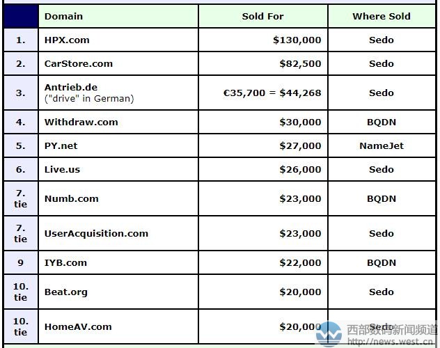 DN榜:三字母域名HPX.COM夺冠! “汽车商店”中六位成交2月8日消息,上周由于全球域名大会NamesCon在拉斯维加斯召开,DN榜未公布交易情况。本期的DN榜涵盖了1月22日–2月4日期间成交价最高的域名,其中三声母域名HPX.COM以130,000美元排在第一,约合人民币81万元。 域名HPX.COM注册于1999年,对应有“惠普系、虎扑讯、红皮鞋、黑螃蟹”等诸多丰富的含义,适合用于鞋业、美食、资讯等网站平台。据外媒报道,此次收购域名HPX.COM的是一家加密货币服务商Hypex,官网域名为Hypex.io。小编猜测,Hypex公司下一步可能就是升级品牌域名了,毕竟HPX.COM比Hypex.io更简洁大气,也更易于推广和宣传。 排名第二的域名是carstore.com,成交价为82,500美元,约合人民币52万元。这也是前一期sedo榜的周冠军。该域名主体由单词“car”(汽车)和“store”(商店)组合而成,很适合搭建汽车电商,应用价值不俗。目前对应有台湾汽车百货(carstore.com.tw)。 接着是以44,268美元成交的德国域名Antrieb.de,约合人民币28万元。“Antrieb”是一德语单词,相当于英文中的“drive”(驾驶、驱动),在德国是含义清晰的常用词语,应用价值不错。 紧随其后的是通过BQDN成交的域名withdraw.com,成交价为30,000美元,约合人民币19万元。“withdraw”有“撤销、退出、取(钱)”的意思,是比较通用的英文动词。因此域名withdraw.com对于国外用户而言,记忆和输写优势都不错,适合多个领域建站使用。 接下来,两字母域名py.net以27,000美元结拍。作为两声母域名,py.net对应有“朋友、便宜、评优、配乐、批阅、聘用”等诸多词语,适合搭建招聘网、社交平台以及折扣电商网站等,可应用的空间较大。 除此以外,美国域名live.us以26,000成交,该域名对应使用频率很高的英文单词,具有“居住”的意思。英文域名numb.com和userAcquisition.com均以23,000美元成交,前者有“麻木”之意,后者是“用户获取”的意思。 其他更多域名交易情况,详见下表: