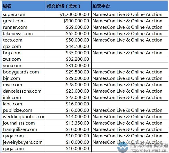 Namejet 2月成交数据:“超级”域名759万元结拍!“伟大”紧随其后3月5日消息,近日国外Namejet平台公布了其二月份域名销售情况,以五位数美元成交的域名共有22个,其中成交价格zui高的是super.com,以1,200,000美元在线结拍,约合人民币759万元。 域名Super.com注册于1997年,其“超级、极好、痛快”等含义通用常见,是日常生活中比较喜闻乐见的词语。该域名对应有不少优质终端,比如:意大利高端太阳眼镜、中石化润滑油公司旗下super(赛派润滑油)、佳人日化旗下品牌super(赛派)、赛派皮具super等。之前我们报道过域名super.com在namescon大会上结拍,随后在2月份完成交易。 随后是同样在namescon会议上以900,000美元结拍的域名great.com,约合人民币567万元。该域名注册于1997年,具有“伟大的、优异的、重大的、很好的”等意思,含义正面积极。由于没有特定的行业指向性,域名great.com适用于游戏、电商、娱乐、金融等多个领域。 域名runner.com以69,000的结拍价排在第三,约合人民币43.6万元。该域名是“赛跑者、跑步者”的意思,在体育及健身运动领域用得较多,因此很适合搭建体育赛事网站、跑步软件等,应用价值不错。据whois信息显示,runner.com目前已经转移到了Strong Incorporated公司民下,背后买家疑似Adam Strong。 紧随其后的是有“假新闻”之意的英文组合域名fakenews.com,成交价为65,000美元,折合人民币41万元。据Alexa排名显示,此前fakenews.com在美国排名为304,789,搜索访问量还不错,很适合搭建新闻资讯类网站或者辟谣网站。 此外,三字母域名cpx.com、boj.com、zwz.com、yon.com、bjn.com等均五位数美元成交,其他域名结拍情况详见下表: