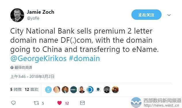 国民城市银行售出域名DF.COM!国人接手!3月5日消息,上周五知名博主兼投资人Jamei Zoch在Twitter上曝料称:美国国民城市银行City National Bank售出了极品两字母域名DF.COM。目前这枚域名已经转移到了国内平台,所有者显示为“lin yu”。 City National Bank(国民城市银行),总部设在克利夫兰,俄亥俄,美国,创立于1845年,曾经是存款,抵押贷款和房屋净值信用线方面在美国十大银行之一。子公司全国城市房贷记做在美国的第一抵押贷款。该银行官网启用首字母简写的域名CBN.COM。 而除了持有CBN.COM这样的精品三字母域名,据已有的whois历史记录显示:City National Bank从2014年便持有极品两声母域名DF.COM。今年2月底,域名DF.COM从国民城市银行转入了escrow账户,随后在3月初,所有者正式变更为“linyu”。由此可以判定,域名DF.COM的确被国人收购。 域名DF.COM注册于1993年,距今已有25年历史了,含义上具有“大福、单反、杜甫、点饭、东方、豆腐、订房”等数十个词义,适用于珠宝、旅游、美食、预定等诸多领域,应用空间十分广阔。目前与之对应的终端就有周大福珠宝、德芙巧克力以及东方财富网等。 目前,域名DF.COM尚未启用,不过又一枚重量级的域名回国,不得不说国人买买买的实力真是强大!据统计,全球672枚两字母域名汇总,已有179枚在国人手中了。 来源新闻资讯:国民城市银行售出域名DF.COM!国人接手!