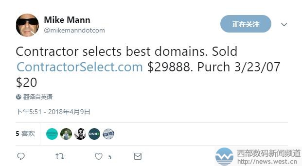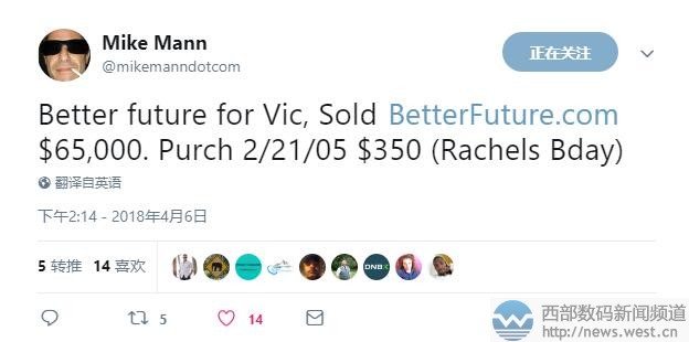 大佬Mike Mann又出米:“美好未来”域名六位数成交!成本仅350美元!4月10日消息,就在几小时前,国外域名大佬Mike Mann发推称,以29,888美元出售了英文组合域名contractorselect.com,约合人民币18.8万元。另外,前两天Mike Mann还以65,000美元售出了域名betterfuture.com,也再次让大家见识了大佬不凡的销售能力。 域名contractorselect.com是由英文单词“contractor”(承包人、订约人)和“select”(挑选)组合而成,可用来搭建相关项目承包平台。目前有新闻资讯平台Contractor与之对应,官网启用域名contractormag.com;另外马尼拉船运商JS Contractor也与之对应。 值得一提的是,这枚超18万元成交的域名contractorselect.com,由Mike Mann在2007年3月收购,成本仅为20美元。十多年过去了,该域名的市场价值已增长上千倍。 同样身价备增的还有域名betterfuture.com,该域名由Mike Mann在2005年2月以350美元收购,如今成交价高达65,000美元,约合人民币41万元。域名betterfuture.com直译为“更好未来、美好未来”,其含义非常不错,正能量十足,适合搭建公益、家居、旅游等诸多平台,应用价值不俗。 据搜索发现,国外旅游平台Better Future便与域名betterfuture.com完美契合,该平台的官网域名为better-future.com。如果要考虑品牌升级,毫无疑问,域名betterfuture.com会是个绝佳选择。