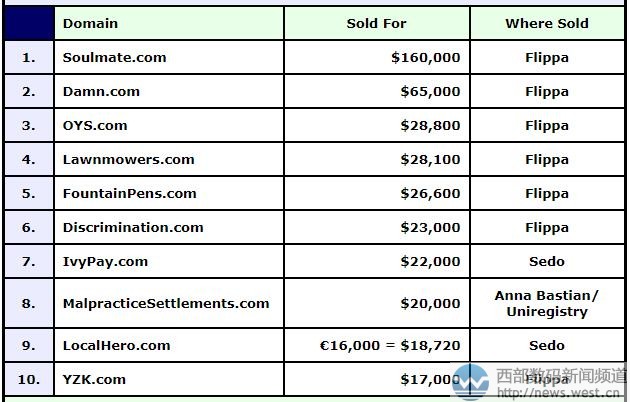 来源三五互联新闻资讯,原文链接:英文域名“灵魂伴侣”以108万元高居DN榜首!