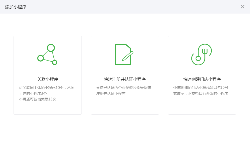 一个公众号可关联10个同主体的小程序,3个不同主体的小程序。