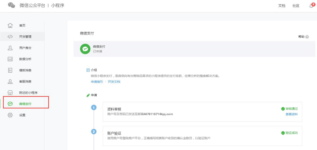 3.微信支付(无需线上支付功能跳过该章节)3.1申请微信支付如您使用商城类等涉及线上支付小程序,需申请主体认证,通过后即可申请微信支付。个人小程序暂不支持申请微信支付