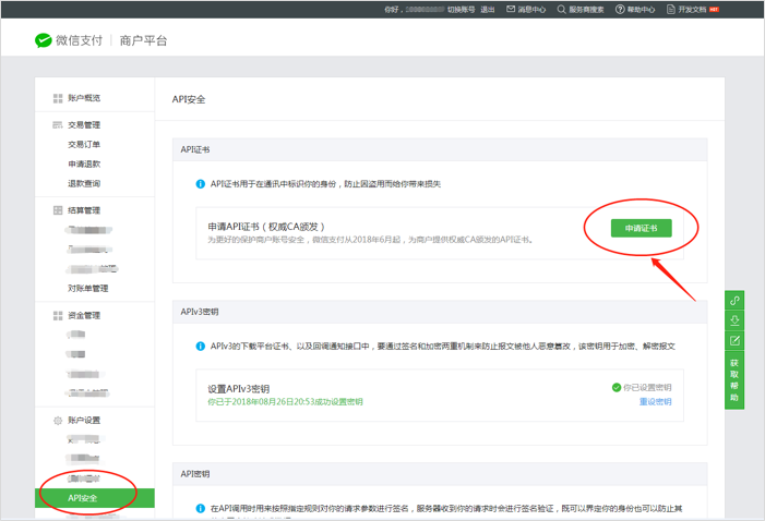 3.2.3 获取API证书注意:请务必按照操作流程去下载证书,期间请不要关闭工具等相关程序,如生成了证书关闭工具的话,会导致证书无法下载,只能等48小时之后重新生成。(证书一年只能生成3次,下载后请保存好) 一、如何判定证书类型为【权威CA颁发的API证书】登录微信支付商户平台点击APT安全,出现如下图所示则为权威CA颁发的API证书