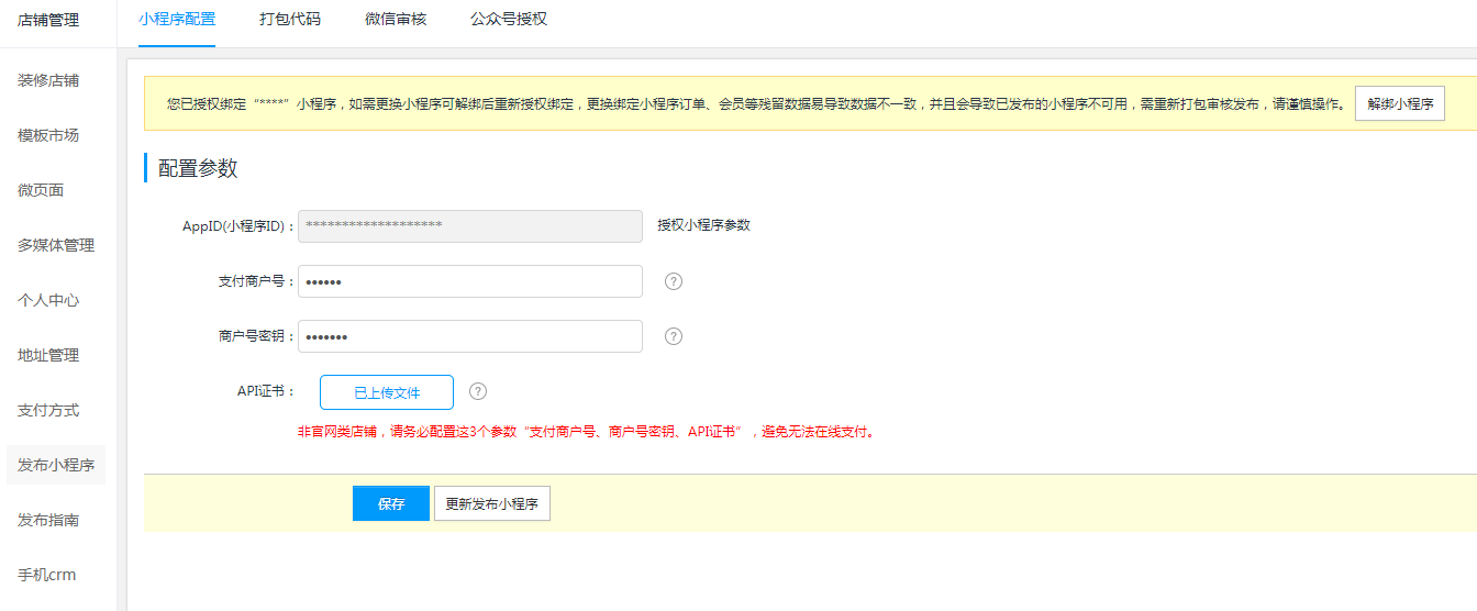 1.2支付参数配置(不涉及线上支付可跳转本章节)小程序商城等涉及在线支付,授权绑定小程序后,进入小程序配置页面,输入微信支付商户号、商户密钥、上传微信支付API证书(各参数获取方式上一章节已说明);