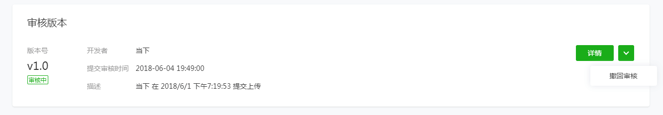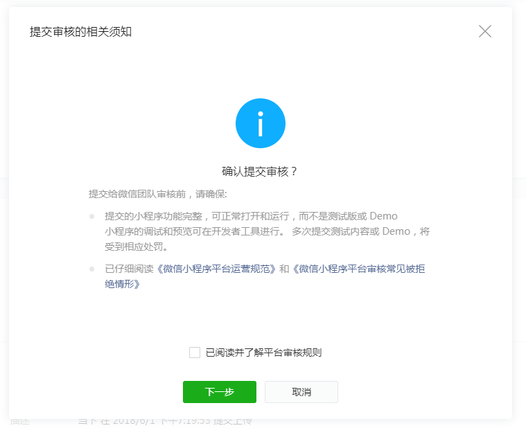 1.4提交审核/发布提交审核:每点击【一键打包】打包小程序,在“微信审核”页面会将会生成一条打包记录,点击【提交审核】将代码包提交到微信进行审核,微信审核周期一般为7个工作日,在提交审核前请先认真阅读《微信小程序平台运营规范》和《微信小程序平台常见拒绝情形》; 审核通过:微信审核通过后,点击【发布】按钮,稍等片刻,即可在手机微信小程序搜索中查到已发布的小程序,完成发布流程; 审核失败:如微信审核失败请注意可看失败提示,及时登录微信小程序后台处理相关问题; 注意:同一时间只允许提交审核1个小程序。