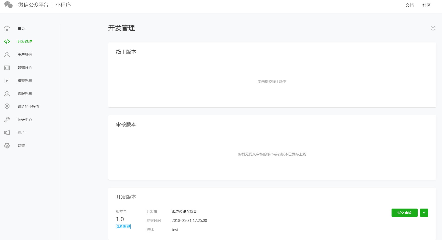 2.7预览并提交审核登录微信小程序后台,在开发管理中,可以看到上一步中上传的小程序
