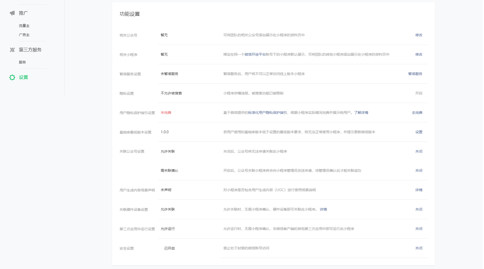 第一步:登录小程序管理后台在【设置-功能设置-用户隐私保护指引】点击【去完善】