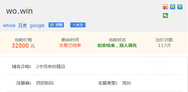 17.win可以解释为“一起赢”本身是一个两位数保留域名,拍卖过程中经过了88次竞价,最终拍出46000元。wo.win可以理解为“我赢”,是一个两字母域名,经过117次竞价,最终拍出32000元。