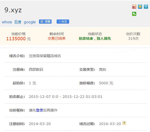 9.xyz域名113.5万高价结拍,单数字行情持续升温三五互联12月22日讯,昨天,极品稀缺单数字域名9.xyz在三五互联以113.5万高价结拍。 继极品单数字域名6.xyz 和8.xyz分别以80万元人民币和52万元人民币高价结拍后,9.xyz也压轴登场,“9”与汉字“久”“酒”同音,被当成是代表“长久”的数字,酒文化的象征;同时“9”也有“九五之尊”寓意美好之意,建站好用,也是投资上的佳品。 域名投资人小皮就曾以短短几分钟一口价买入一枚单数字域名9.com.cn,交易价格近200万元!而已被启用的域名9.cc现已建成“9点嘻嘻娱乐城”网站,据”楼盘网”创始人戴跃介绍,当时“9.cc”价格更是不菲,将近百万元人民币。2007年,视频网站6间房也以百万级的价格收购单数字域名了6.cn。 俗话说:“物以稀为贵”,此次结拍的单数字域名9.xyz本身就是极其罕见的品种,是当之无愧的硬通货域名,每个后缀总共只有10个。其中不乏3.cn、6.cn这样的大终端对于单数字域名的应用,抢手程度可见一斑。 据调查,近年来,随着字母域名的日渐稀少,数字域名,尤其是单数字域名俨已成当下域名投资的热点,尤其在今年,更是迎来爆发期。 域名因自身属性,注册一个,就少一个。就数字域名而言,尤其对单数字域名来说,那更是稀罕至极了。再加上单数字域名全球通用,不分国家,不分语言,不分行业,终端应用范围非常广泛。而且,收购者都是大终端,意愿非常强烈,价格自然不菲。 所以,未来市场相信还有更多的域名投资者将目光瞄向单数字,可以预见的是,往后单数字域名或其他较为冷门的域名类型,会逐渐在市场中崭露头角。 目前,我们还不知道9.xyz是否会启用,但是从行情来看,未来单数字域名还将持续升温,并且单数字域名在品牌推广上很有优势。像京东这样知名的公司都启用了3.cn,也是看重这点。而我们从此次的成交价格可以看出.xyz域名的价值也正在受到更多人的认可,自谷歌重组更名Alphabet,并大胆启用abc.xyz后,更是掀起一阵注册热潮,抢手程度一目了然。三五互联8元的注册价格更可以说是非常便宜。之前就有许多人就因为xyz注册局突然开放3数字,8元就注册到了3数字域名,大赚一笔。 不过,在注册或收购域名的过程中,投资者既要时刻掌握市场行情,也要谨慎判断,盲目投资域名的行为不可取。