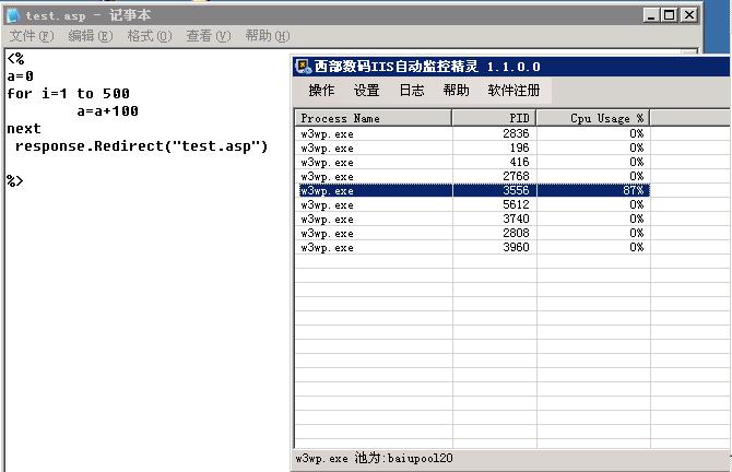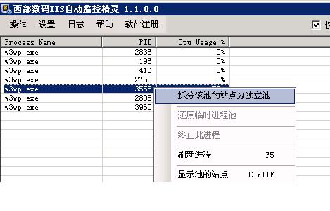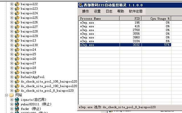 1.在iis自动监控精灵中可以观察到哪个进程池最占cpu,点击后在软件最下方会显示其对应的进程池名称。 |