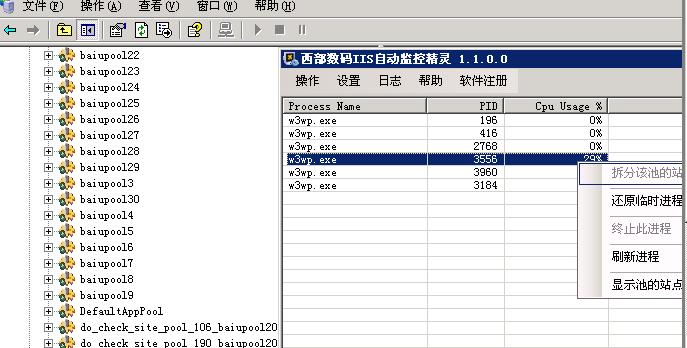 4.点右键选择“还原临时进程池”可以将刚才拆分出来的临时进程池do_check_site???还原至原来的进程池baiupool20. 试用版只能还原id<10的网站。 5.注册版可以全自动完成以上操作,无需人工拆分、还原。适合大型虚拟主机服务商的服务器自动监控。 |